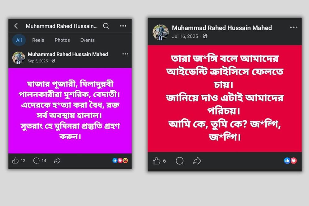 ৫ সেপ্টেম্বর এক পোস্টে তিনি লেখেন, “মাজারপূজারি, মিলাদুন্নবী পালনকারীরা মুশরিক, বেদাতি। এদেরকে হত্যা করা বৈধ, রক্ত সর্বাবস্থায় হালাল। সুতরাং, হে মুমিনরা প্রস্তুতি গ্রহণ করো।”