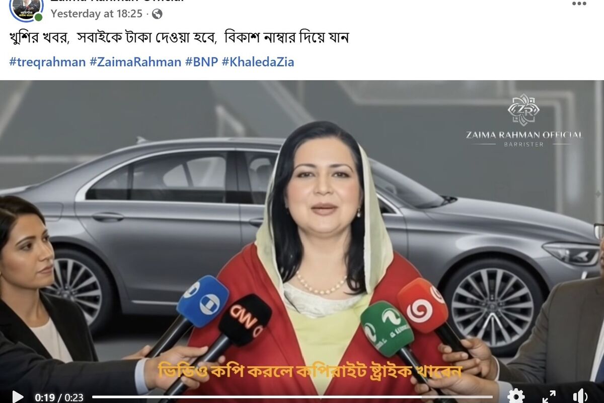 গতকাল ৭ ডিসেম্বর পোস্ট করা একটি ভিডিও ফেসবুকে ভাইরাল হয়েছে। Zaima Rahman Official নামের একটি ভুয়া ফেসবুক আইডি থেকে পোস্ট করা ভিডিওতে দেখা যাচ্ছে তার মা ডা. জুবাইদা রহমান ক্যামেরার সামনে দাঁড়িয়ে বলছেন, “সবাইকে একটা খুশির খবর শোনাতে চাই, আপনারা অনেকেই আমার মেয়ে জাইমা রহমানের কাছে সাহায্য চাচ্ছিলেন। সবাই ভিডিওর কমেন্টে বিকাশ নাম্বার দিয়ে যান। আমরা সবাইকে সাধ্যমত সহায়তা করার চেষ্টা করবো ইনশাআল্লাহ। আর হ্যা, অবশ্যই ভিডিওটি শেয়ার করতে হবে আর পেইজটি ফলো করতে হবে। আর কমেন্টে আপনার সমস্যাটা বলে দিবেন। তাহলে আমরা আপনার সমস্যা অনুযায়ী আপনার বিকাশ নাম্বারে টাকা পাঠাবো। আর অবশ্যই বিএনপিকে ভোট দিবেন। ধন্যবাদ।”
