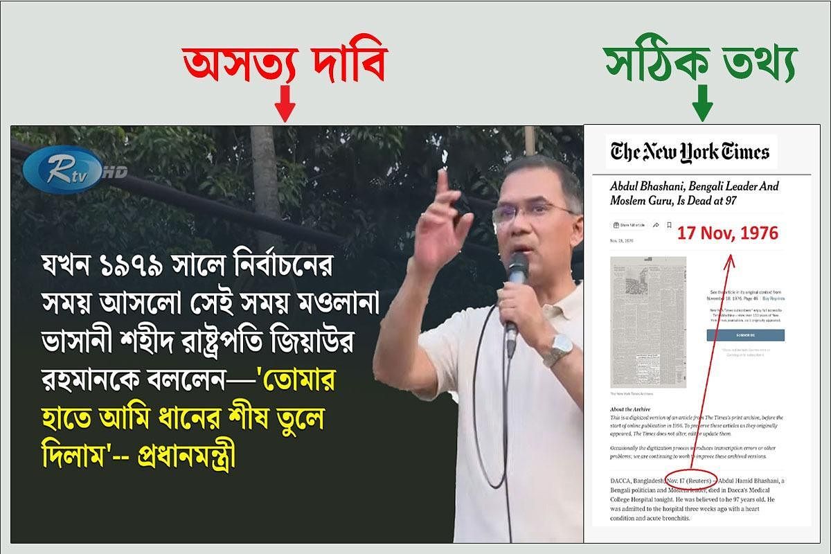 তবে প্রধানমন্ত্রীর এই দাবিটি সত্য হওয়ার সুযোগ নেই। কারণ, মওলানা ভাসানী মারা যান ১৯৭৬ সালের ১৭ নভেম্বর। বিশ্বের শীর্ষ সংবাদমাধ্যমগুলোতে ভাসানীর মৃত্যুর সংবাদ প্রকাশিত হয়।