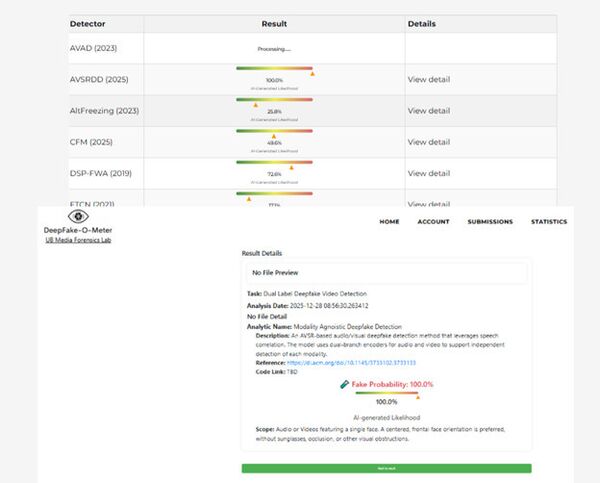 এছাড়াও, এআই ভিডিও শনাক্তকারী টুল DeepFake-O-Meter–এর একাধিক মডেল ভিডিওটিকে এআই হিসেবে শনাক্ত করেছে।