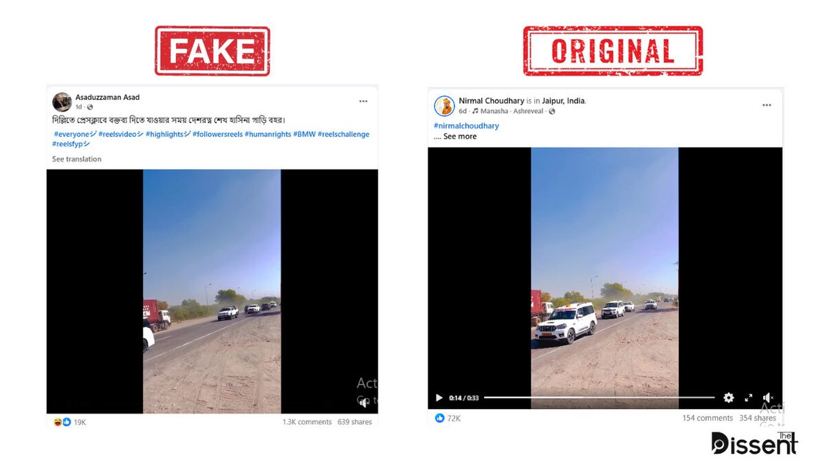 ফেসবুকে ছড়িয়ে পড়া একটি ভিডিওতে একটি বড় গাড়িবহর দেখিয়ে দাবি করা হচ্ছে, “দিল্লিতে প্রেসক্লাবে বক্তব্য দিতে যাওয়ার সময় দেশরত্ন শেখ হাসিনার গাড়িবহর”। এরকম দাবি সম্বলিত কিছু পোস্ট দেখুন এখানে, এখানে এবং এখানে।