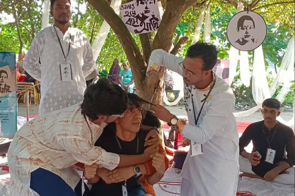 ইসলামপন্থীরা ছাত্রদের চুল কেটে দিচ্ছে দাবিতে প্রতীকী প্রতিবাদের দৃশ্য প্রচার