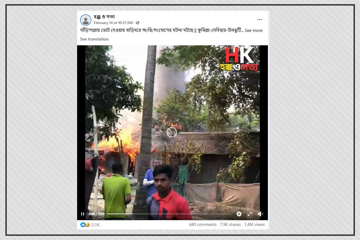 ফেসবুকে একটি ঘরে আগুনের ভিডিও শেয়ার করে দাবি করা হচ্ছে, কুমিল্লার দেবিদ্বারের উনঝুটি এলাকায় দাঁড়িপাল্লা প্রতীকে ভোট দেওয়ায় ঘরবাড়িতে অগ্নিসংযোগের ঘটনা ঘটেছে। “হক্ক ও সত্য” ফেসবুক পেজ থেকে ভিডিওটি পোস্ট করা হয়।