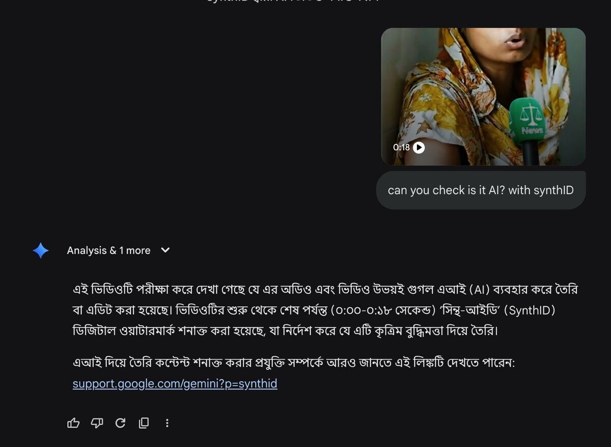এআই কন্টেন্ট শনাক্তকারী টুলস SynthID-তে ভিডিওটি আপলোড করে জানা গেছে যে এর অডিও এবং ভিডিও উভয়ই গুগল এআই (AI) ব্যবহার করে তৈরি বা এডিট করা হয়েছে। ১৮ সেকেন্ডের ভিডিওটিতে শুরু থেকে শেষ পর্যন্ত 'সিন্থ-আইডি' ডিজিটাল ওয়াটারমার্ক শনাক্ত করা হয়েছে। যা নির্দেশ করে যে এটি কৃত্রিম বুদ্ধিমত্তা দিয়ে তৈরি।