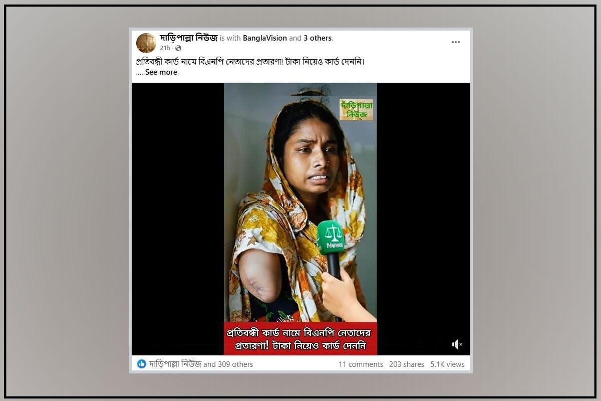 “প্রতিবন্ধী ভাতার নামে বিএনপি নেতাদের চরম প্রতারণা! টাকা নিয়েও কার্ড দেননি, ফেরত চাইলে হুমকি” দাবিতে একজন প্রতিবন্ধী নারীর একটি ভিডিও সামাজিক যোগাযোগ মাধ্যমে ব্যাপকভাবে ছড়ানো হয়েছে। জামায়াত সমর্থক একাধিক ফেসবুক পেইজ থেকে ভিডিওটি পোস্ট করা হয়েছে। এধরনের দু'টি পোস্ট দেখুন এখানে এবং এখানে