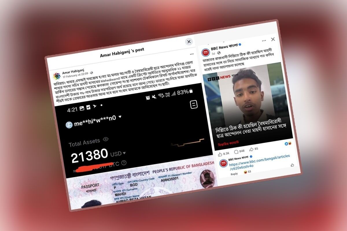 'Amar Habiganj' এর পোস্টে লেখা হয়েছে, "বানিয়াচং থানার এসআই সনন্তোষ হ/ত্যা মা/মলার আ/সামী ও বৈষম্যবিরোধী ছাত্র আন্দোলন হবিগঞ্জ জেলা শাখার সদস্য সচিব মাহদী হাসানের Mehediwarn0 নামে একটি ক্রিপ্টো আইডিতে আনুমানিক ২১ হাজার মার্কিন ডলারের সন্ধান পেয়েছে কলকাতা গোয়েন্দা সংস্থা ন্যাশনাল টেকনিক্যাল রিসার্চ অর্গানাইজেশন। যার বাংলাদেশী টাকায় ৩৮ লাখ টাকার সমপরিমাণ অর্থ রয়েছে বলে জানা গেছে। ভারতে পা/লিয়ে থাকা মাহদীকে শীঘ্রই তাকে গ্রেফারের আওতায় আনা হবে বলে সংবাদ মাধ্যমকে জানিয়েছেন সংস্থাটি।"