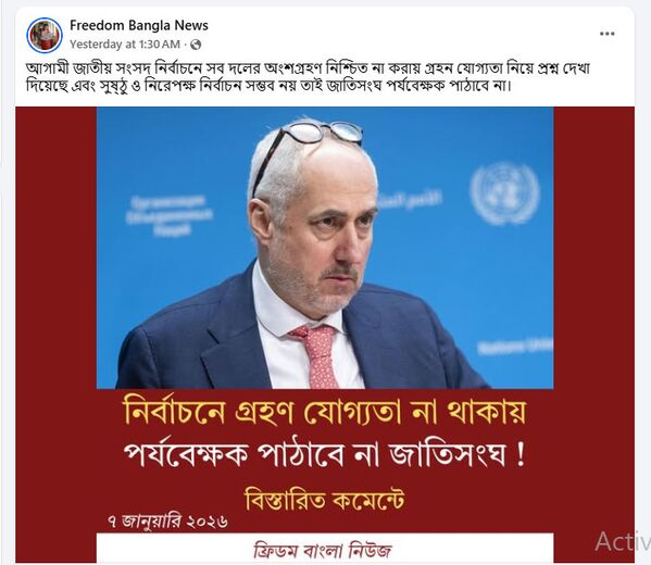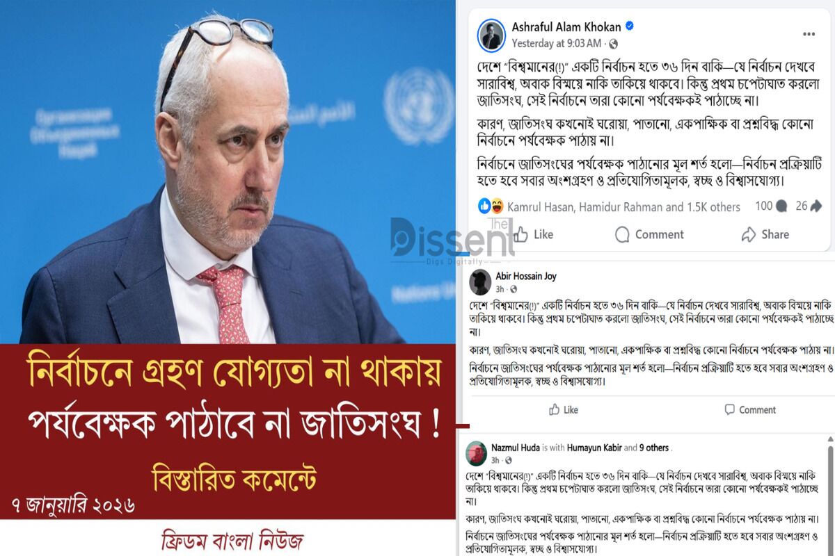 In this context, Ashraful Alam Khokan, former deputy press secretary to fugitive former prime minister Sheikh Hasina, made a Facebook post. He wrote: “Only 36 days remain for a so-called ‘world-class(!)’ election—an election that the whole world is supposed to watch in amazement. But the first blow has come from the United Nations: they are not sending any observers to this election.”